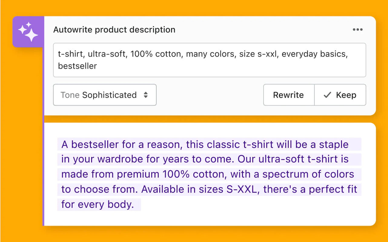 - Use Shopify Magic to beat writer’s block and automatically create product descriptions.